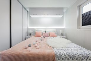 BEDROOMS: upholstered beds with LED headboard + mattresses, hanging cabinets with LED lighting
